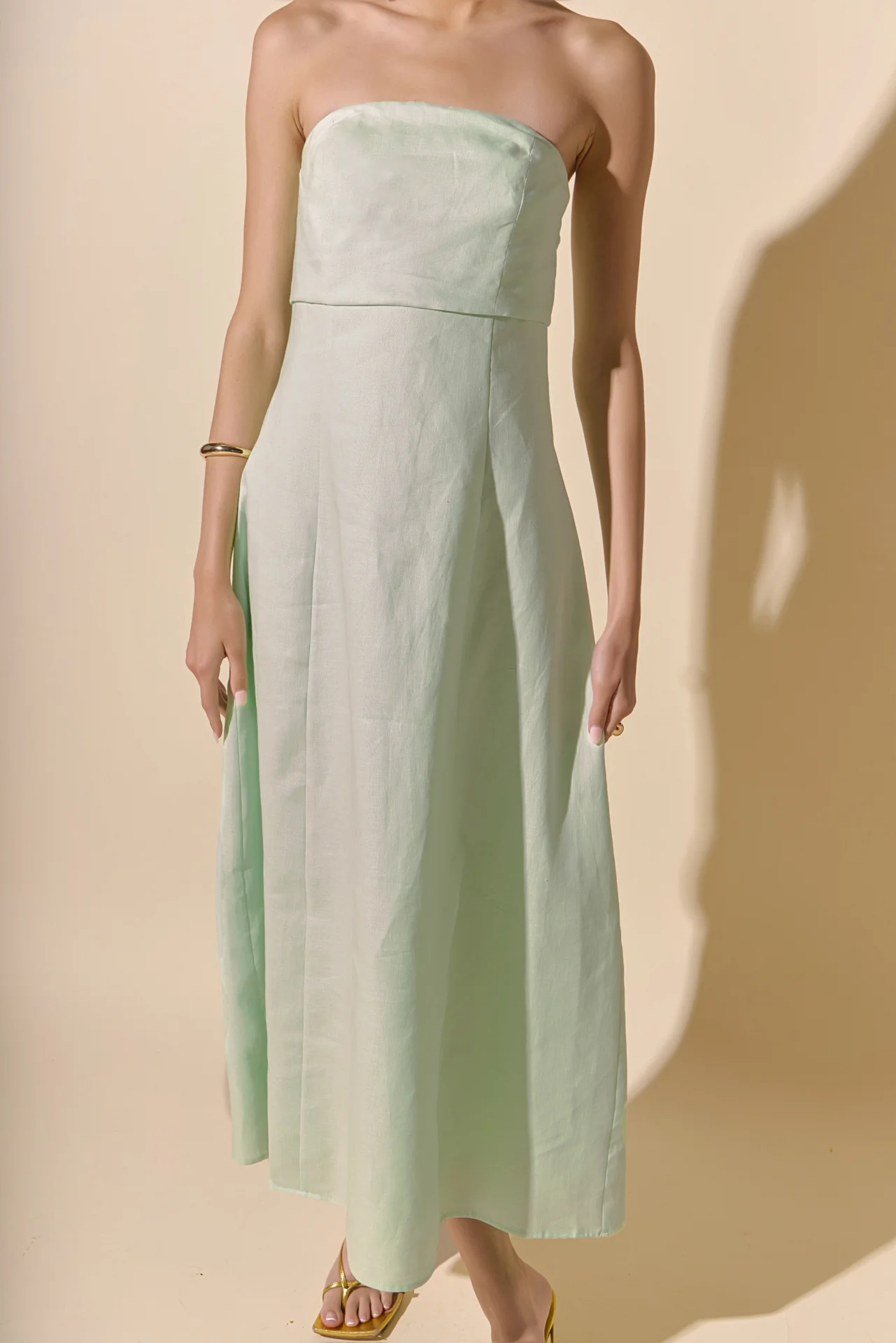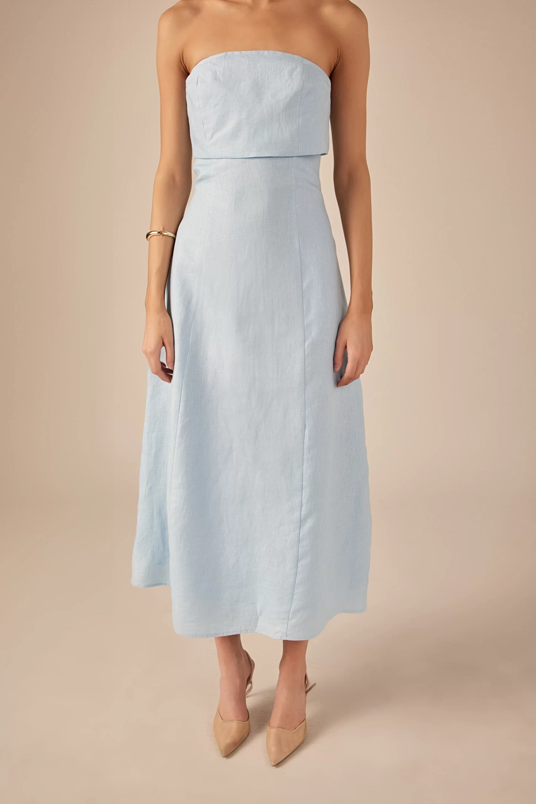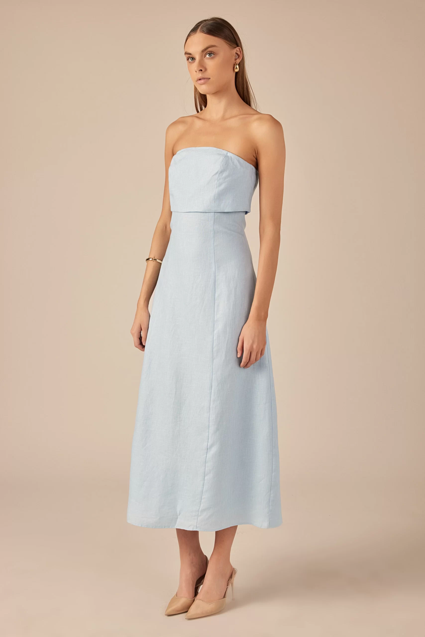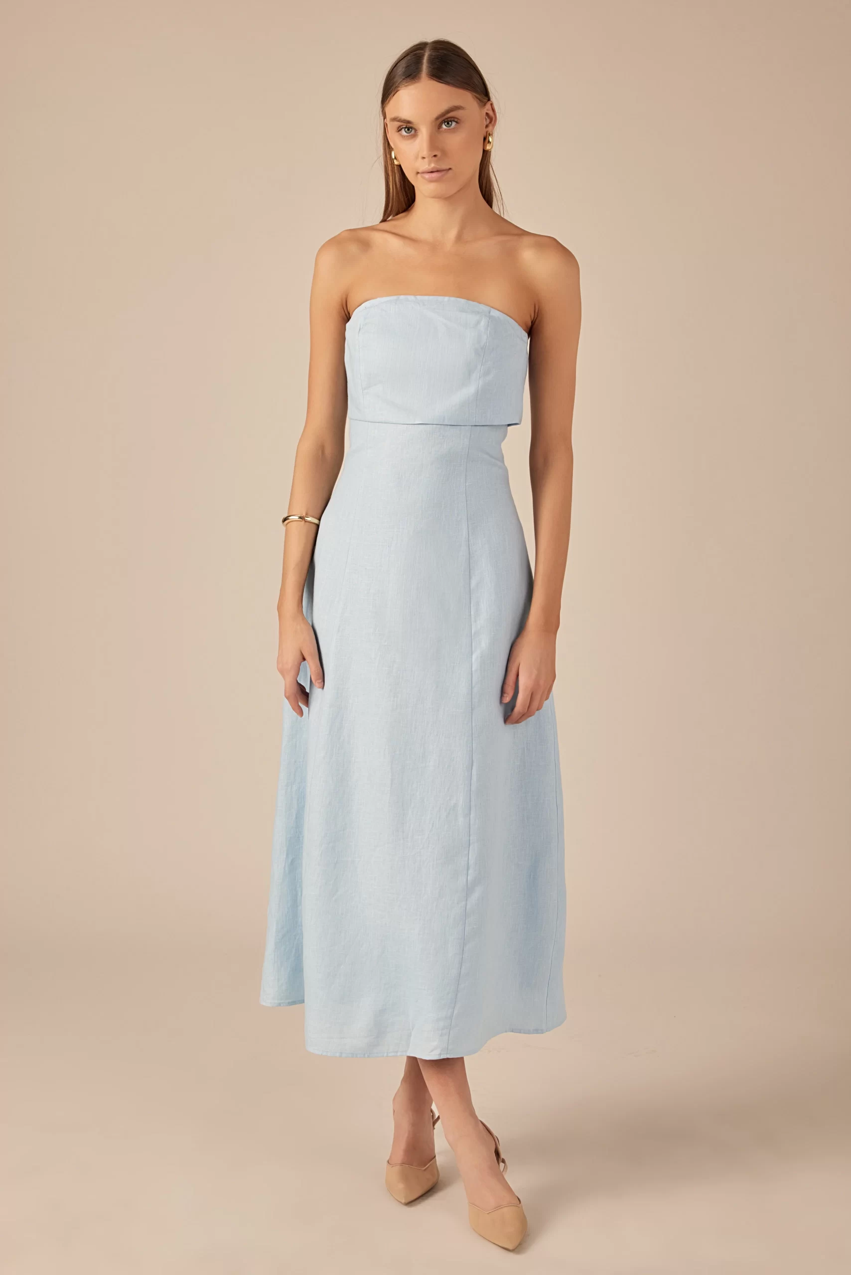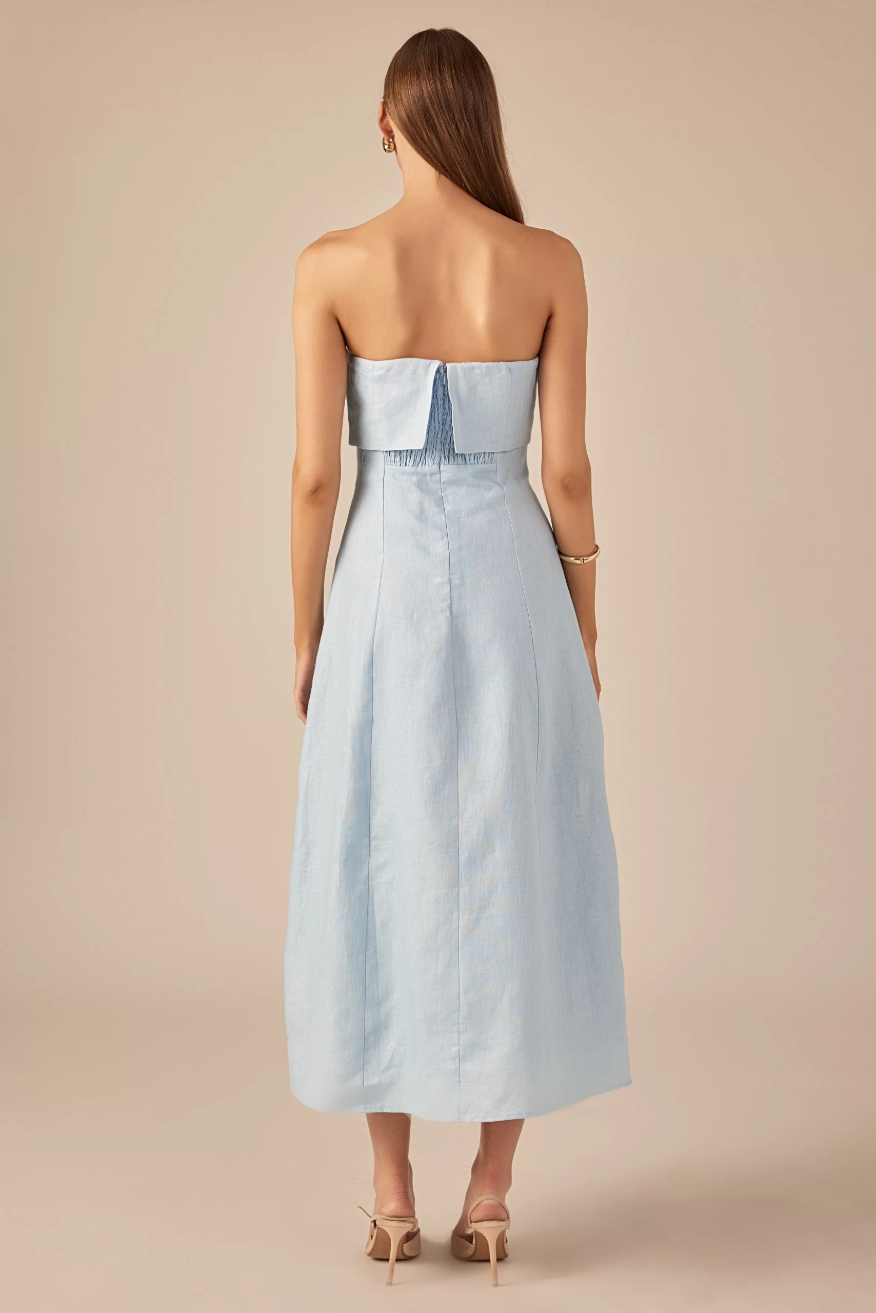 Introducing our Lucia Folded Strapless Linen Maxi Dress, perfect for warm weather and effortless style. Made with high-quality linen fabric, this dress is breathable, lightweight and oh-so-comfortable. The folded bust adds a touch of sophistication, while the strapless design and smocking detail create a flattering silhouette. Versatile and chic, this dress is ideal for any occasion. Elevate your wardrobe with this must-have piece that combines comfort and style. Shop now and make a statement with our Lucia Folded Strapless Linen Maxi Dress. Linen Folded bust Strapless Smocking Back zipper Fit and flare Maxi length Lining Hand Wash Cold Do Not Bleach Do Not Tumble Dry Iron Low Shell: 100% Linen Lining: 100% Cotton Exclusive of Elastic HN3869D Chest: 33″, Total length: 52.75″ S PISTACHIO, OCEAN BLUE: Height 5’10” / Bust 34″ / Waist 26″ / Hip 36″